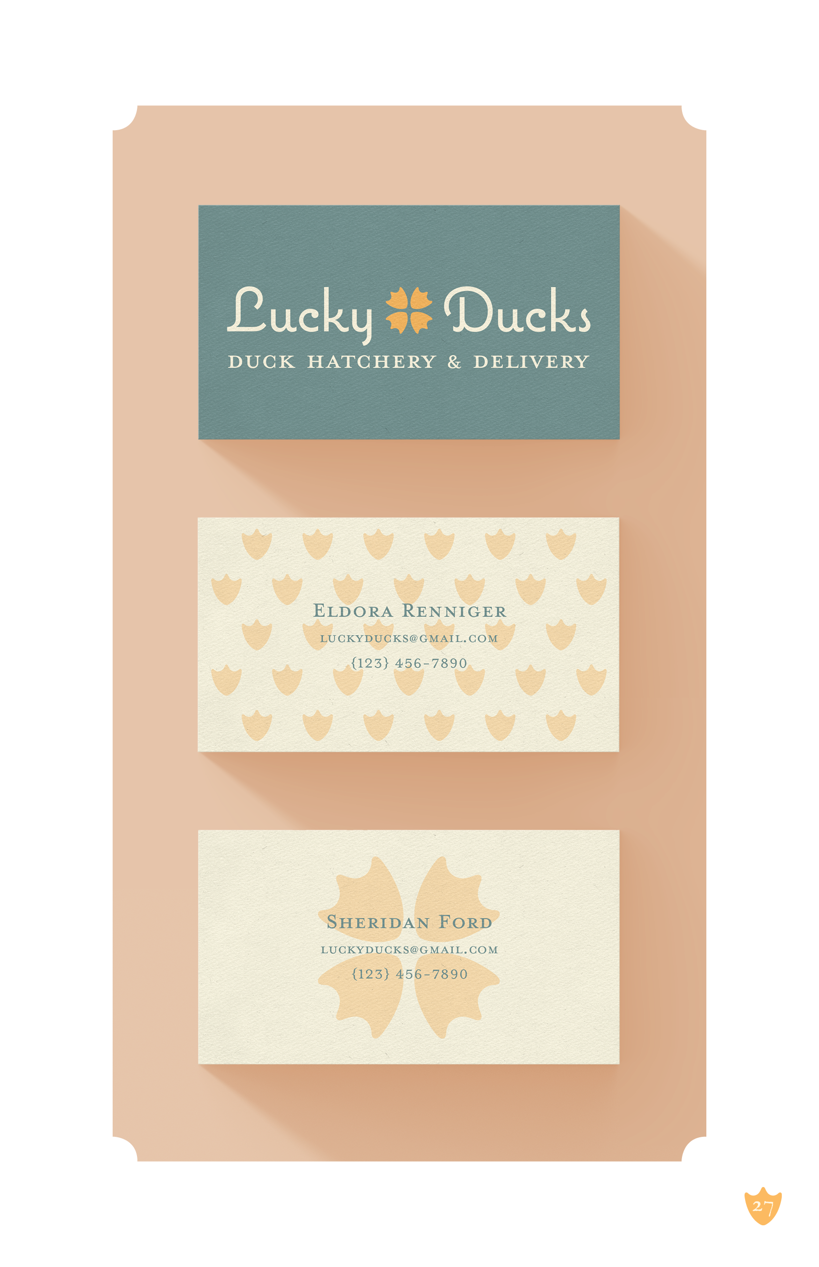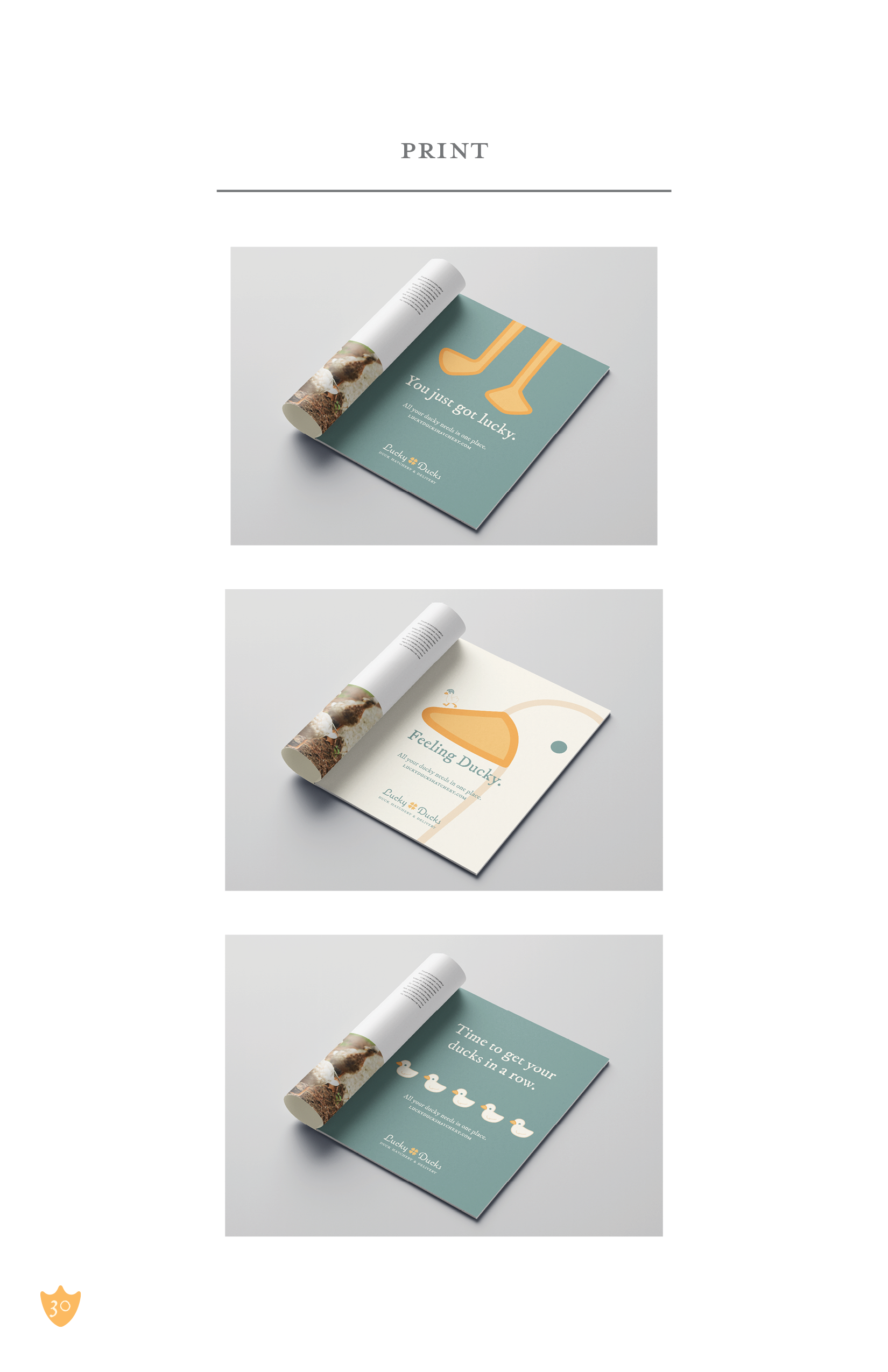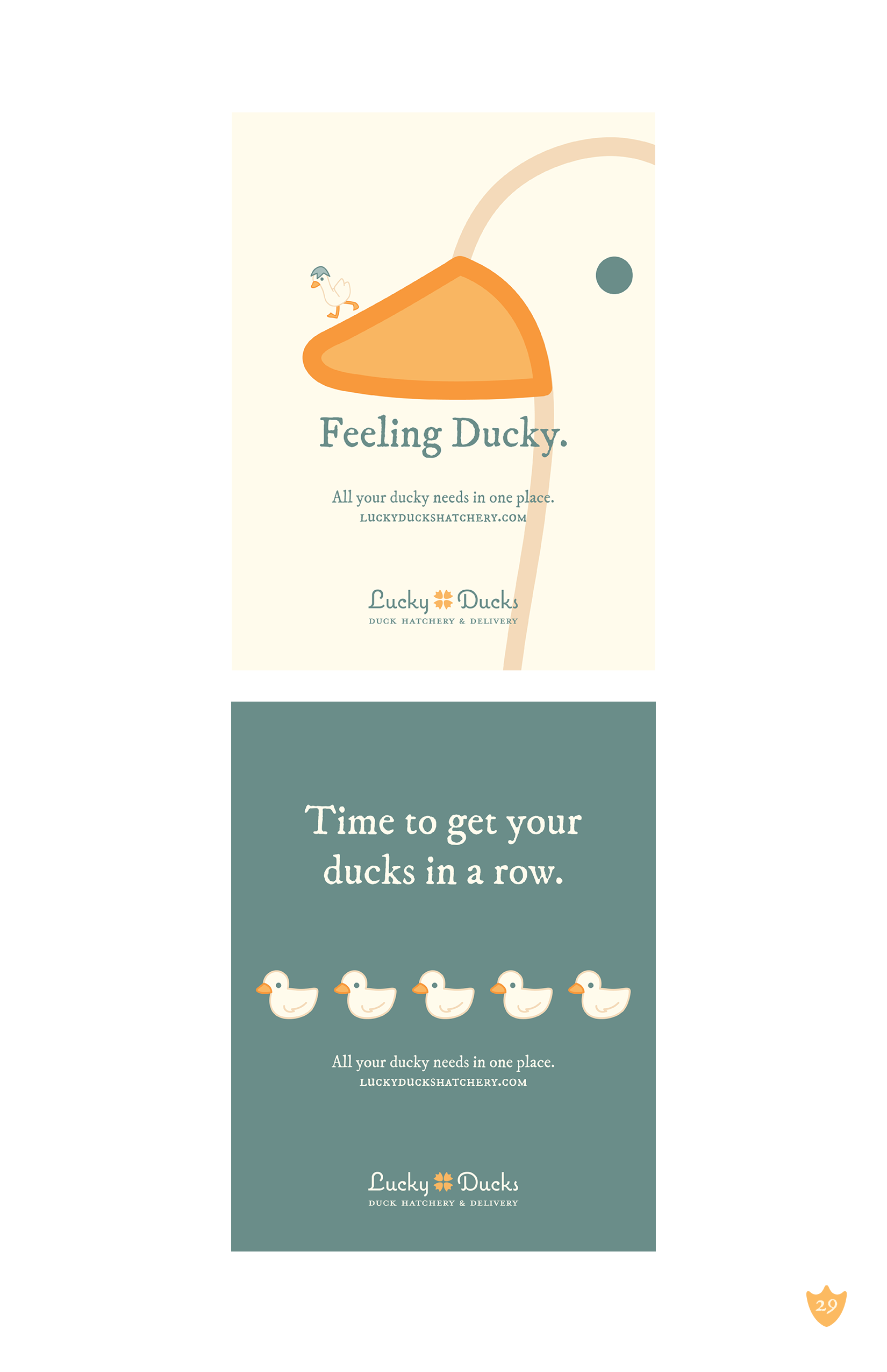 Lucky Ducks was a semester-long project for my Brand Identity class. The brand is fictional, but I had a lot of fun researching ducks and duck-related material to design it!