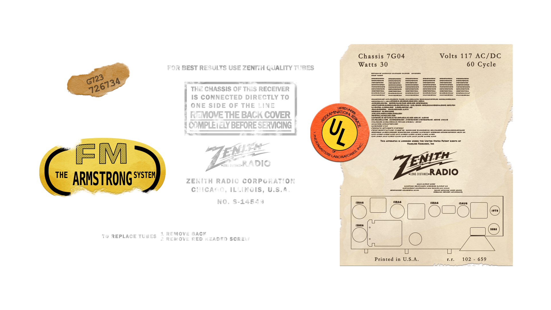 A set of stickers from old Zenith radios I recreated for my 3D modeling class. Photoshop. 2019.